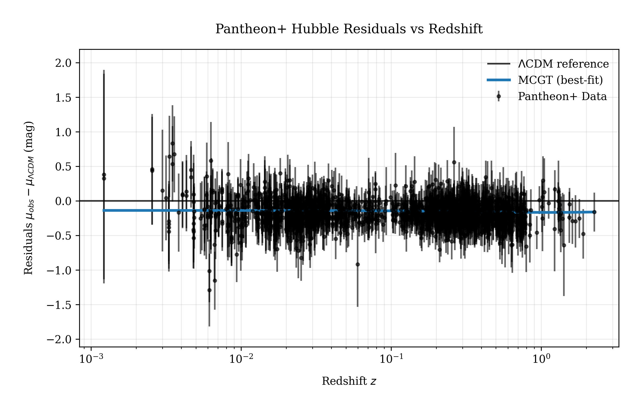 Cette figure démontre l'ajustement du modèle MCGT sur les 1701 supernovae du catalogue Pantheon+. Le modèle permet une réduction spectaculaire de Δχ²≈-151.6 par rapport au modèle standard ΛCDM, résolvant directement les tensions locales et globales.