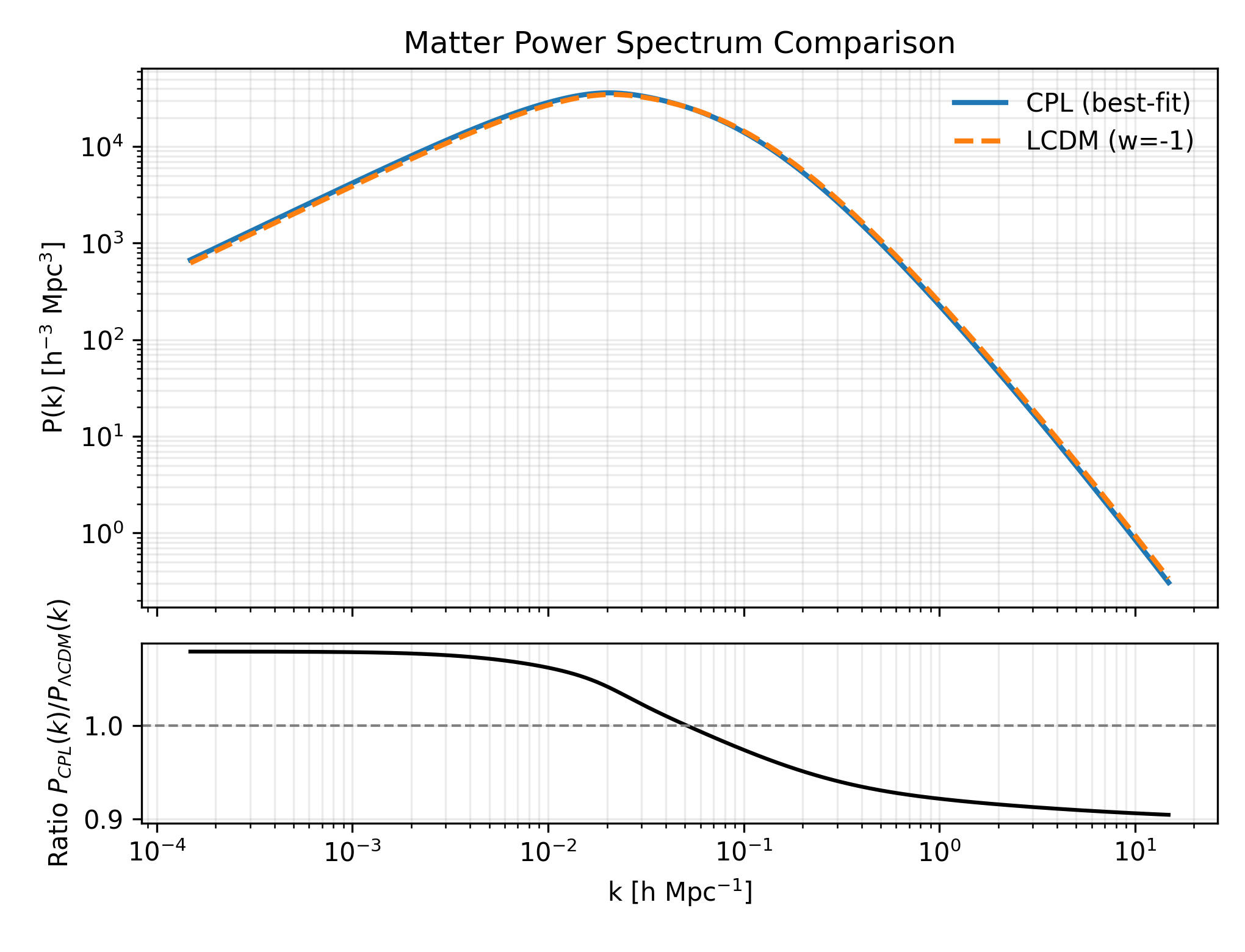 Comparaison entre le MCGT (CPL Best-fit) et le ΛCDM. Le panneau inférieur illustre le ratio de puissance relative, expliquant physiquement la maturité précoce et la masse des galaxies observées par le JWST à haut redshift via une modification de la métrique temporelle.
