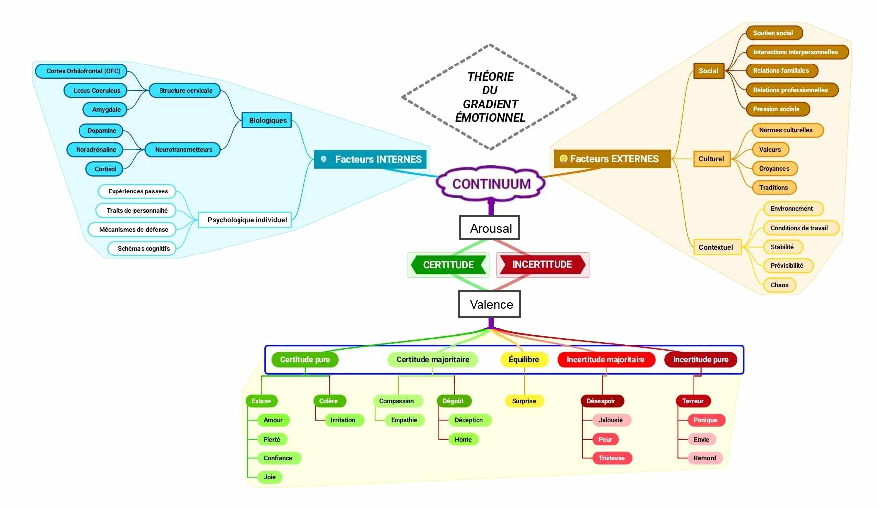 Cette carte heuristique formalise l'architecture intégrative de la théorie, posant l'expérience émotionnelle comme la résultante systémique d'une interaction dynamique entre variables endogènes (substrats neurobiologiques, psychologie individuelle) et exogènes (déterminants socio-culturels et contextuels).Ces afférences convergent vers un continuum central où l'activation physiologique (Arousal) et la polarité cognitive de la Certitude/Incertitude agissent comme variables médiatrices fondamentales. Il en découle une taxonomie spectrale des émotions, hiérarchisée selon le degré de prédictibilité et de contrôle perçu, s'étendant de la Certitude Pure (états d'affirmation homéostatique) à l'Incertitude Pure (états de dysrégulation ou d'entropie psychique).