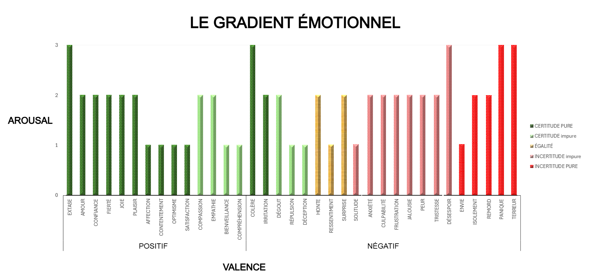 Cette figure propose une topologie des états affectifs structurée par trois dimensions vectrices : la valence (polarité hédonique), l’arousal (intensité de l'activation physiologique) et le degré de certitude (gradient chromatique oscillant de la certitude à l'incertitude pure).Note méthodologique : Cette représentation graphique est à visée heuristique. Les niveaux d'arousal projetés ne constituent pas des constantes psychométriques universelles. Conformément au cadre théorique, ces variables sont sujettes à une variance inter-individuelle et contextuelle significative, modulée par les paramètres dynamiques inhérents à chaque sujet et situation.